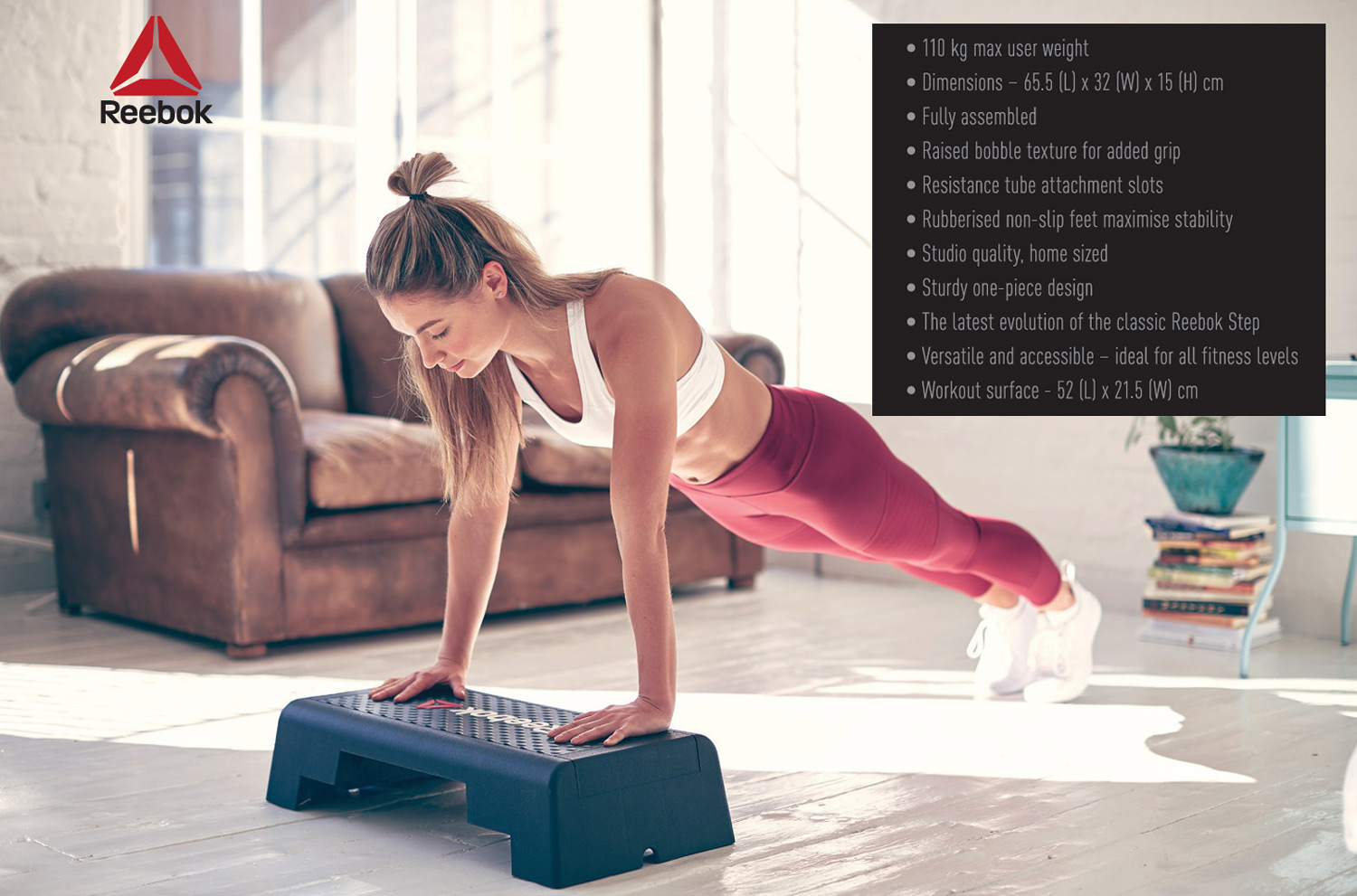 Dette alsidige stepbræt er ideelt til mange forskellige træningsformer. Med Reebok Step Mini kan du styrke hele kroppen, tone muskler, forbedre din kondition og øge din eksplosivitet gennem plyometriske øvelser. Herunder finder du fire træningsprogrammer, som kan hjælpe dig i gang: